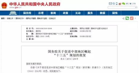 2016年12月23日,國務院下發《關于促進中部地區崛起“十三五”規劃的批復》(國函〔2016〕204號)。